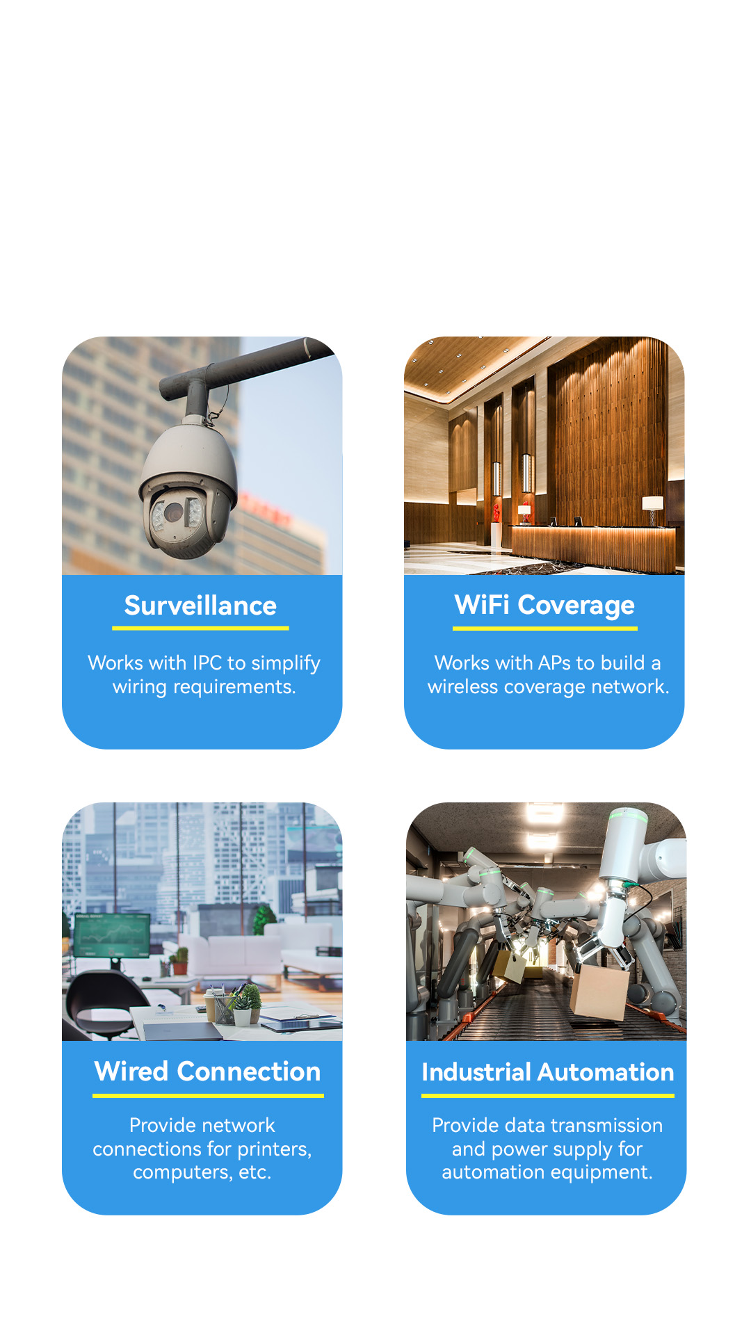 POE port :10/100M full-duplex/ half-duplex modes Uplink port : 10/100M full-duplex/ half-duplex modes 1000M full-duplex mode |